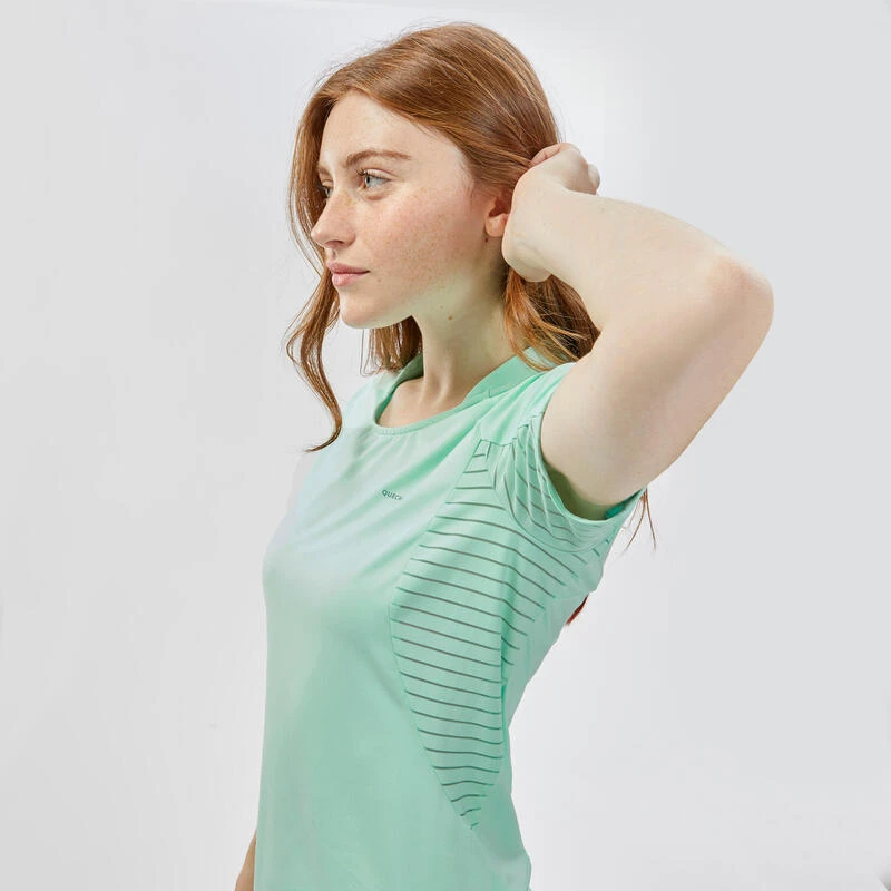Au pied du Mont Blanc, notre équipe de randonneuses a conçu ce t-shirt de randonnée extensible et évacuant la transpiration pour les randonneuses régulièresSon col arrière protégera votre nuque du soleil et des éventuels frottements du sac à dos.